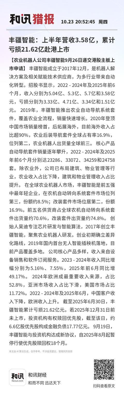 丰疆智能:上半年营收358亿累计亏损2162亿赴港上市